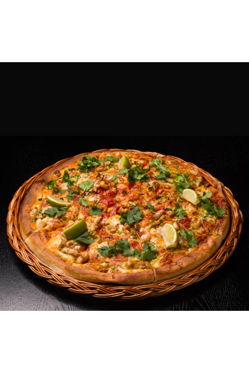 Dollys tomatsaus og osteblanding, marinert kylling, ananas, cashewnøtter, vårløk, jalapeños og søt chilisaus. Toppes med fersk koriander og limebåter.